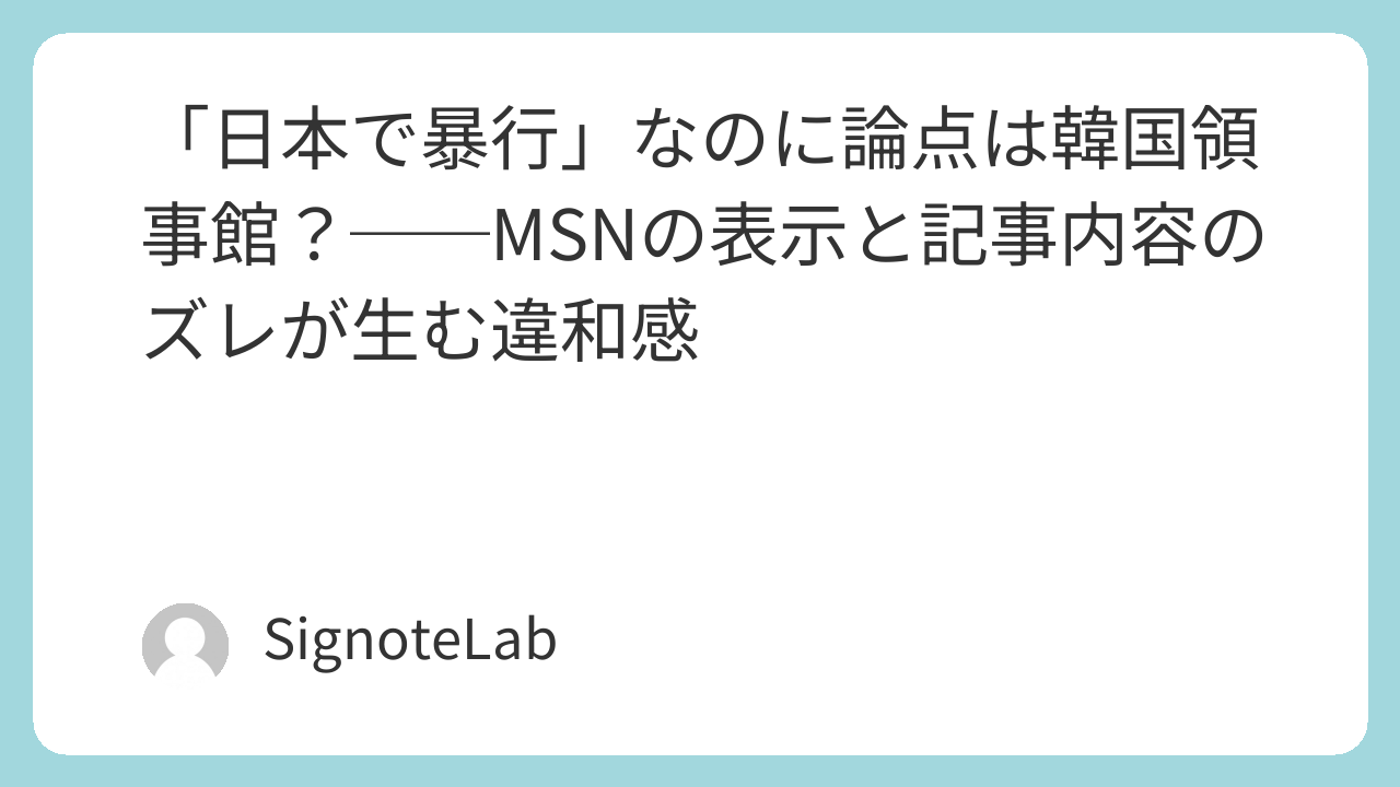 日本で発生した暴行事件をめぐる報道(中央日報日本語版)を、事件(一次事象)と領事館対応(二次事象)に分解し、さらに MSN上の表示(見出し・カテゴリ)が誤読を誘発する構造を整理する。